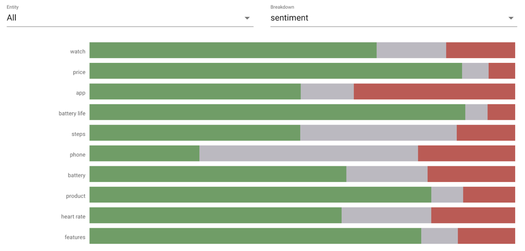 If we filter the dashboard for the word “app,” the term “notifications” stands out as the biggest pain point. Clearly, a quick win to improve ratings for this watch would be to improve the notification experience in app.