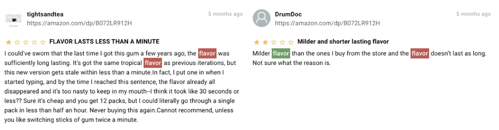 The dashboard for a popular chewing gum tells us that the top entity discussed is “flavor.” Clicking into the reviews, customers claim that this product is not as flavorful and doesn’t last as long as they’d hoped.