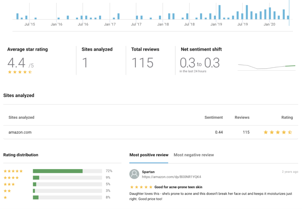 Brandwatch Reviews can help spot when products are falling below consumer expectations. When we look at this baby sunscreen, we see that the most negative characteristics are the terms “pack” and “tube.” Clicking into the reviews shows that users felt misled by the product description when they received a single tube – they thought they had purchased a pack of three.