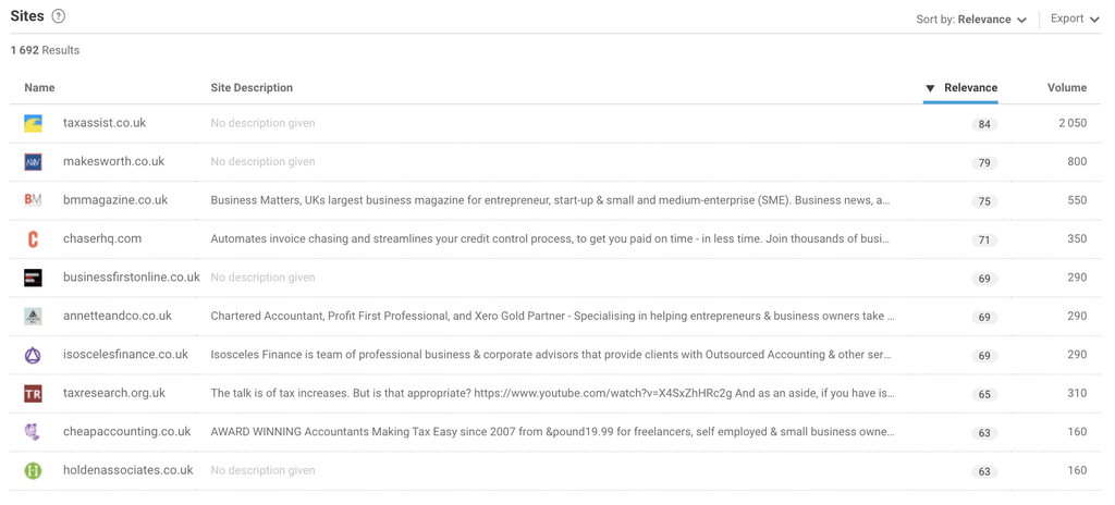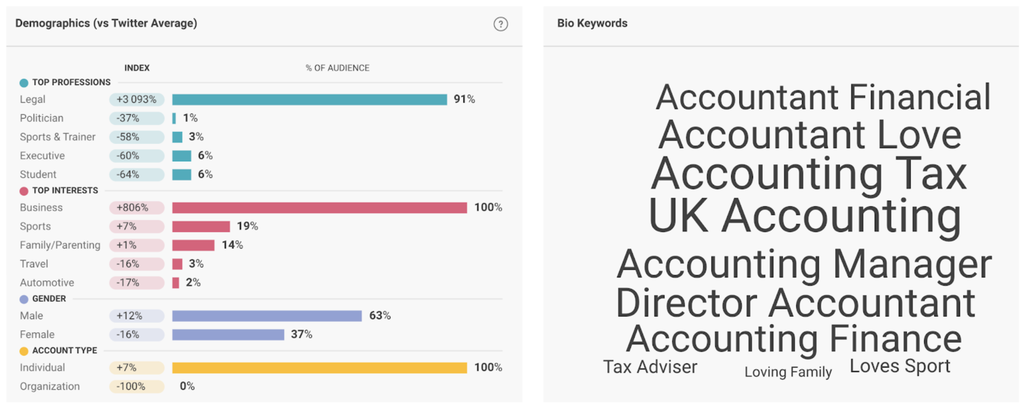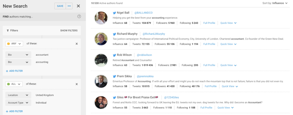 For example, if your target audience is UK-based accountants, you might perform a search to filter Authors by those that have ‘accountant’ or ‘accounting’ within their bio, and they must both be an individual account (as opposed to an organization) and be located in the UK.