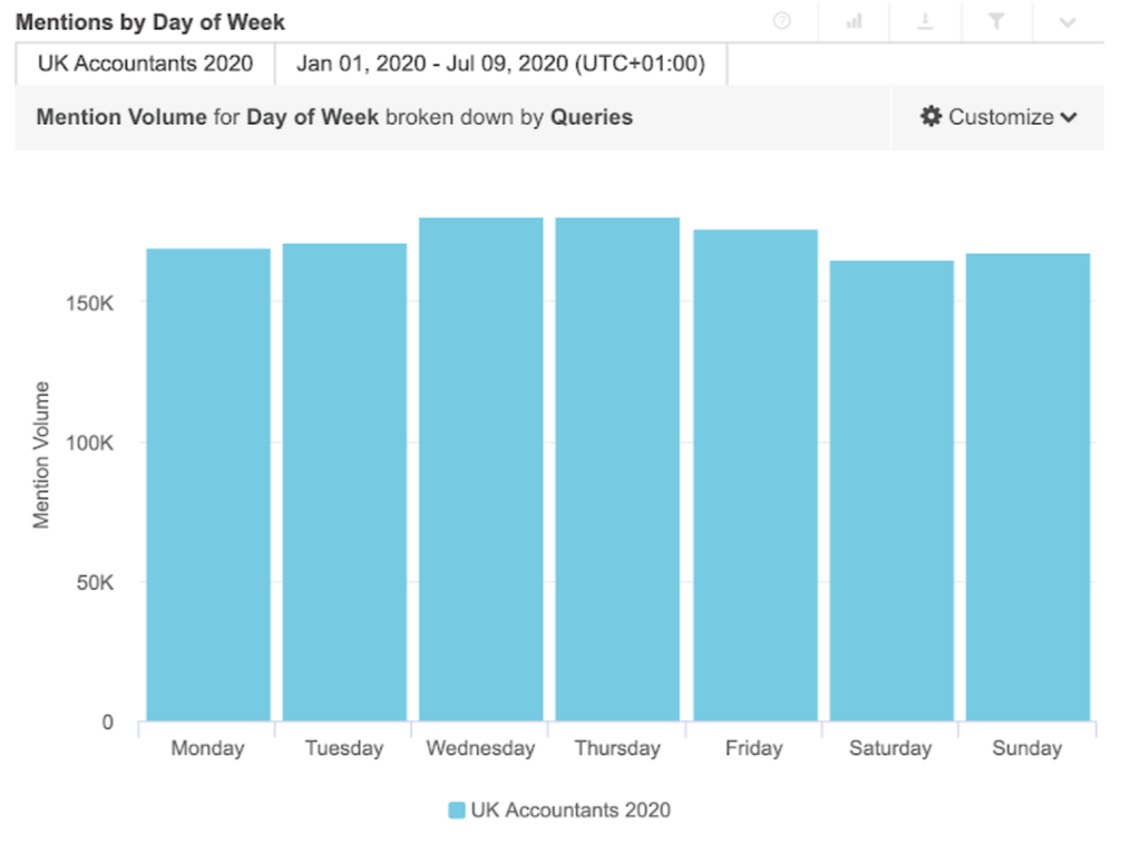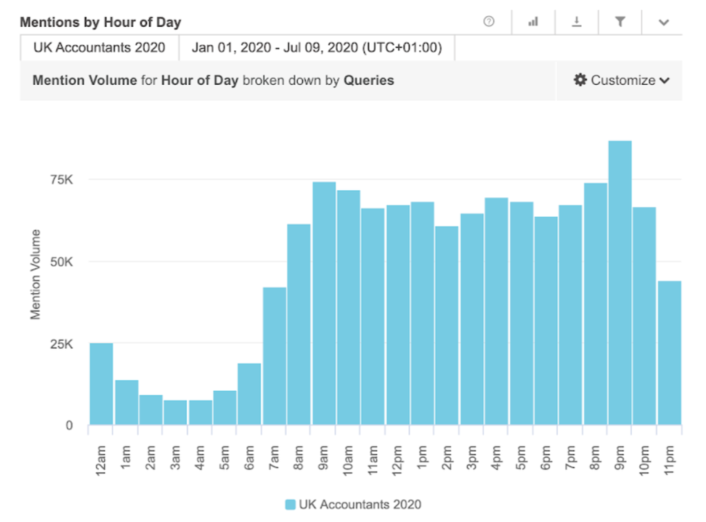 By exporting this list and plugging it into Brandwatch Consumer Research, we can learn more about what accountants are posting about, when they’re most active, the key influencers in the conversation, and more.