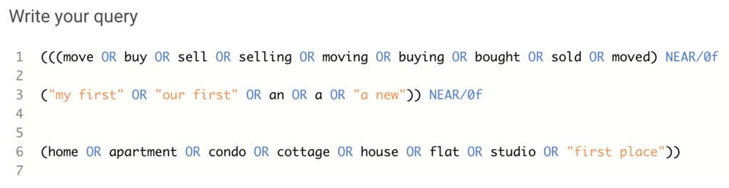 In Brandwatch Consumer Research, this starts with a query. The below example is one you could use to find people talking about buying a home.
