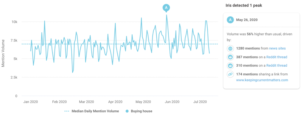 In this example, we’re looking at people discussing buying a home in 2020. There are around 7k posts per day to look at – and that’s a lot to analyze manually.