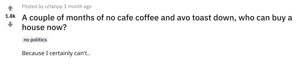 One of the trending stories in the above example is a Reddit thread. Clicking into that thread, we find that it’s all about saving for a house during the pandemic – how much money has been saved by not buying expensive avo toast and coffee?