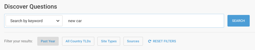 In BuzzSumo, searching for a topic is really easy. Let’s say you’re looking for people talking about buying a new car. The search could be as simple as this:
