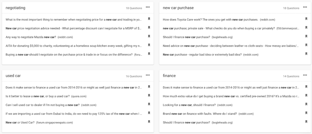 For this example we looked at themes, and the platform surfaced a whole bunch of key questions that are asked about new cars, in relation to particular parts of consumers’ purchase considerations.