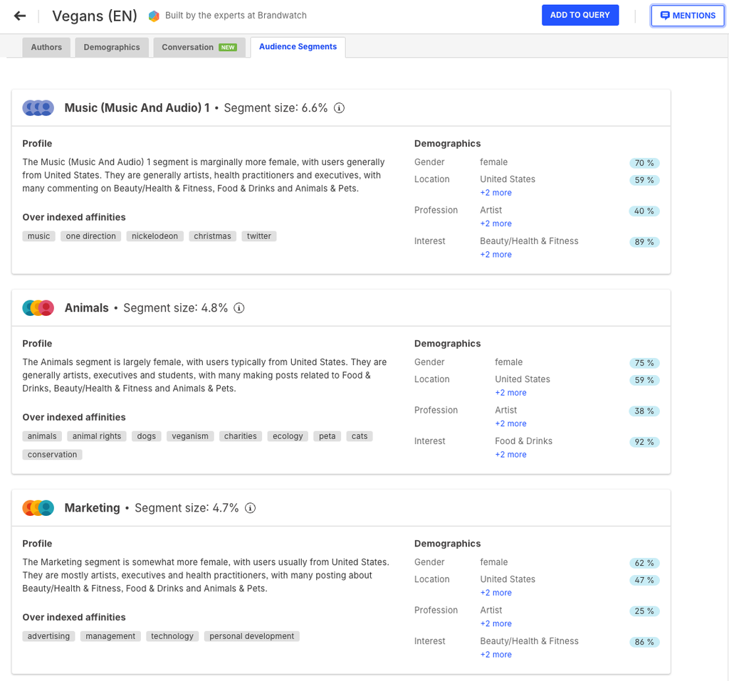 As you can see, this gives a whole new depth of insight compared to just what the general conversation looks like. By looking at different audience segments that go beyond broad demographics, you can learn about the nuances of the conversation – the preferences and opinions of subgroups that are super relevant to your brand.