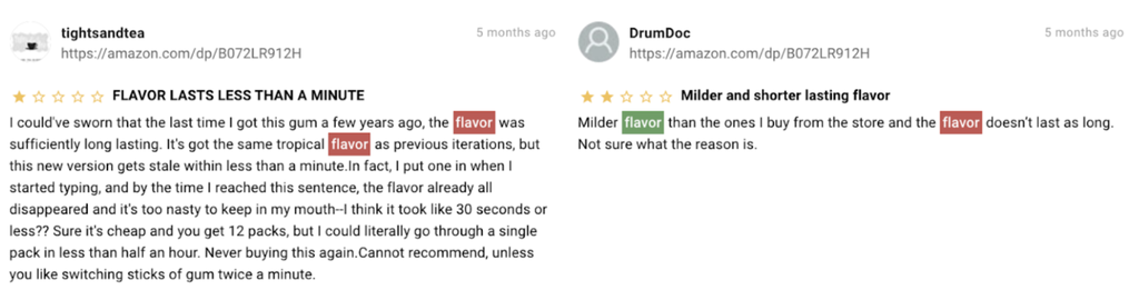 The top entity discussed is “flavor.” Clicking into the reviews, customers claim that this product is not as flavorful and doesn’t last as long as they’d hoped.