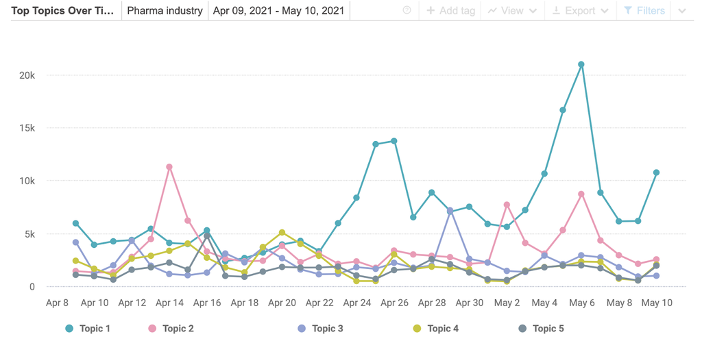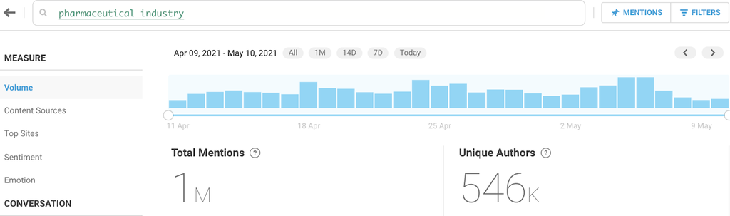 Let’s start with an example. The social conversation related to the pharmaceutical industry is huge, and that’s why segmentation is extremely important. A quick glance at the data in Brandwatch Consumer Research showed that in the period between April 9 and May 10 2021 alone there were over a million mentions and 546k unique authors who published pharma-related content online.