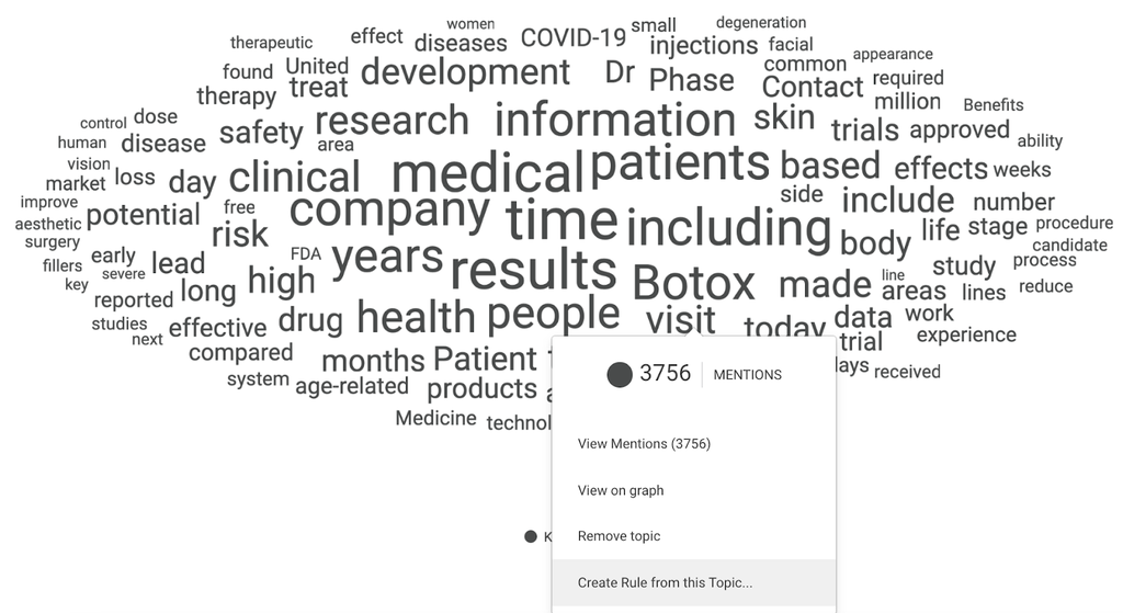 Let’s return to the Botox trend we mentioned above. If researchers wanted to find out what was driving people to decide to get Botox, they could look into the existing dashboards, read through the content, look at word clouds, and review mentions bubbling up in the data set that could potentially become emerging trends. If something is coming up frequently enough in the data, the team could build out rules specifically around those findings to segment the data even further and discover the conversation drivers.