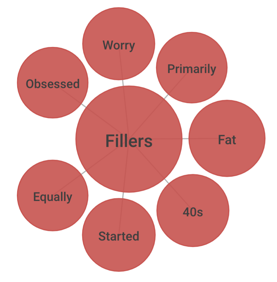 Once the tag is created, a researcher could review the data using the topic cluster component filtered by fillers and watch consumer stories emerge. As you can see from the screenshot below, fillers are connected with several different topics such as ‘40s’, ‘worry’, and ‘obsessed’. Each of these connections could potentially enrich the ongoing research with fascinating details regarding the use of fillers and perceptions around them.