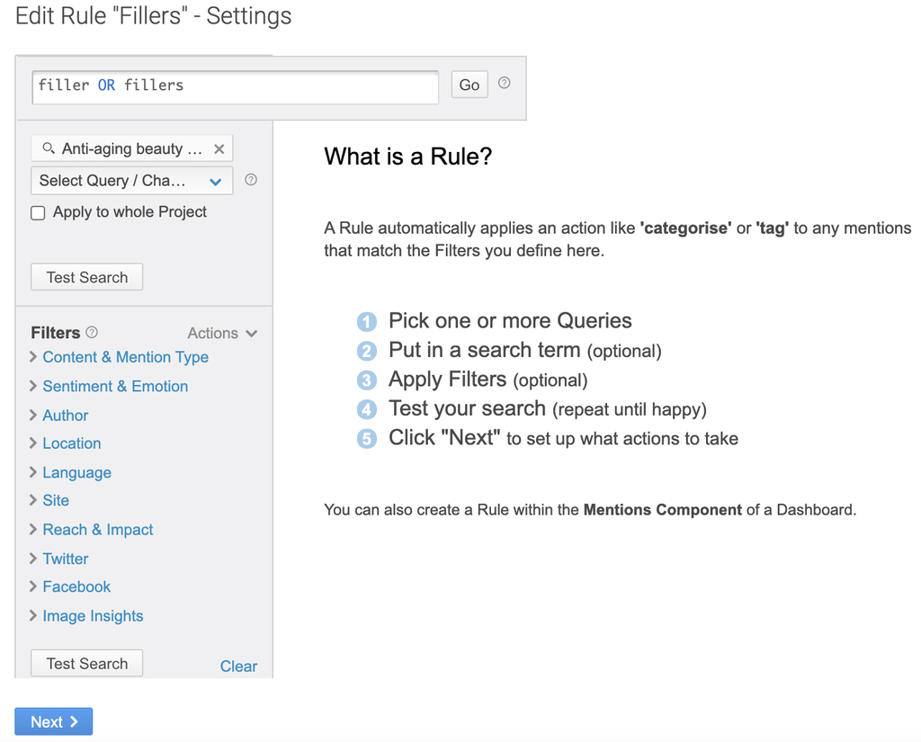 If the team wanted to get really granular about people discussing fillers, they could select additional filters such as the location of the users, author gender, sentiment, etc when building out the rule. Brandwatch Consumer Research allows a great level of customization here.