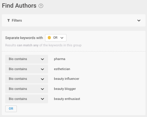 For example, if you were to look for Twitter users who are involved in the healthcare and beauty conversation, your filters might look like what’s shown below. Here, the user bio must contain one of the listed keywords.