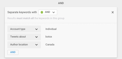 You could do this by adding several additional filters such as “Tweets about” and “Author location”. In the case of Botox, the filters might look like this: