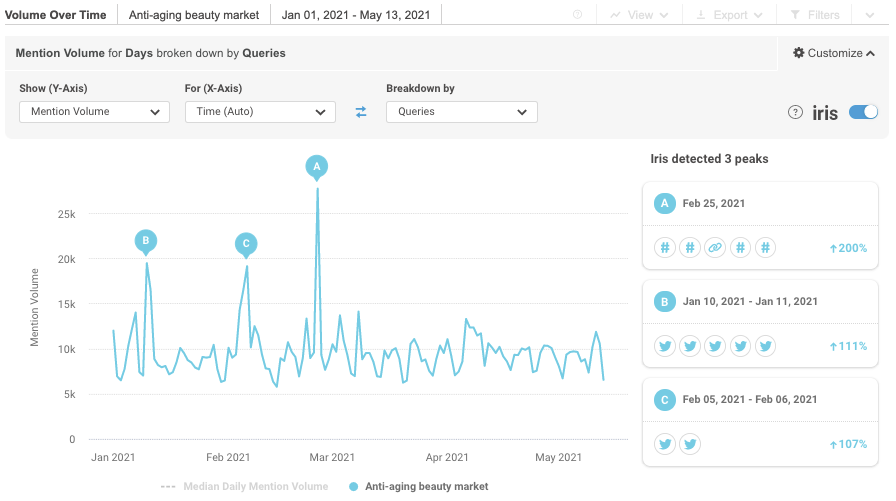 Let’s say a beauty company’s marketing analysts are interested in looking at the anti-aging market specifically to help inform new campaigns. Their research question might be: What topics are trending in the anti-aging conversation?
