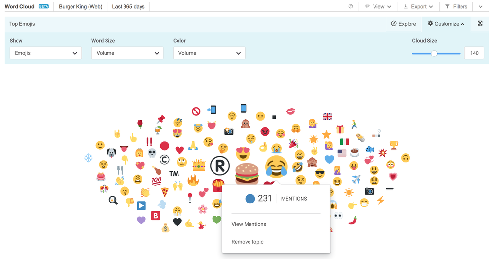 In the first image, you can tell which hashtags were most used in conversations around Burger King, automatically colored by the sentiment of the mentions.