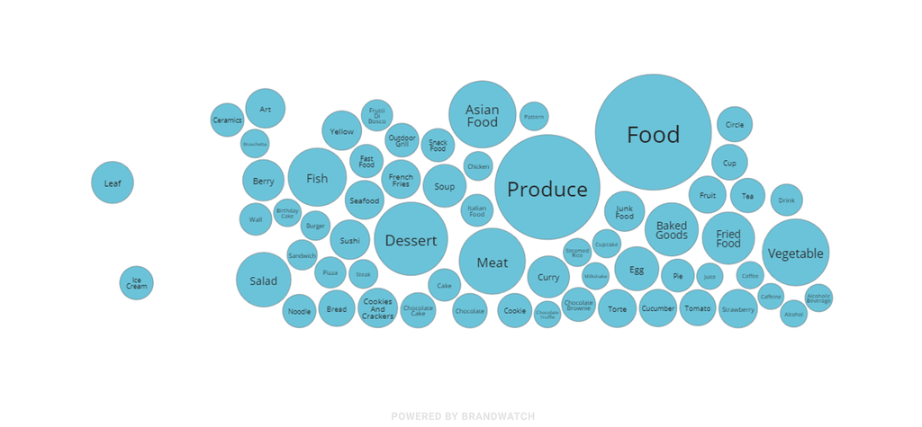It’s a real mix of items, from ingredients to meal types to receptacles. Baked goods, fried food, junk food, and desert suggest photogenic comfort food is very popular, although produce, vegetables, and salad are also particularly prominent.