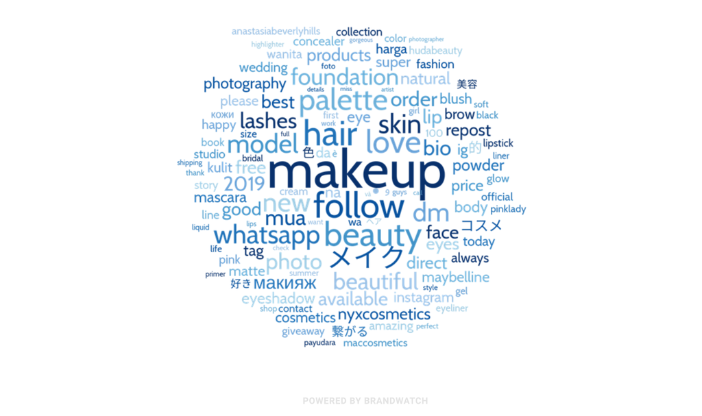 Looking at the main topics of discussion, pink, natural, and glow-y makeup products like highlighter are all very much ‘in’. There’s also a focus on hair, skin, and eyelashes. This word cloud also clues us into the brands that are a part of the trending conversation. NYX, MAC, and Maybelline are all popular.