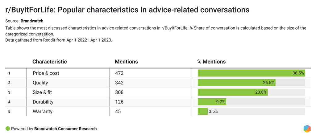 Meanwhile, price was definitely a major part of the advice-related conversations in r/BuyItForLife between April 1 2022 and April 1 2023.