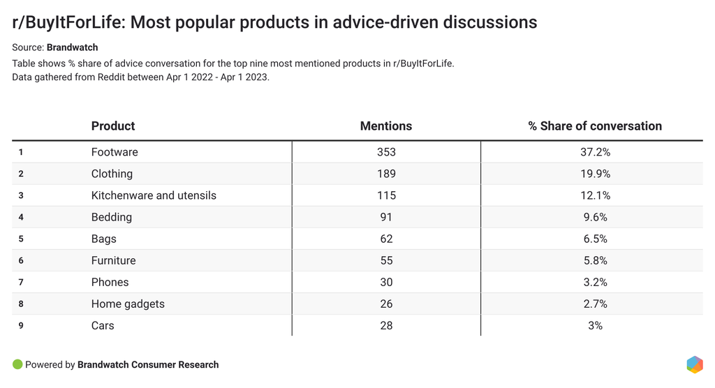 Across these nine groups of products, the footwear category generated the most advice-related mentions, accumulating 37.2% of the categorized conversation. This category also generated significantly more than the second-most popular category discussed in r/BuyItForLife – clothing (close to 20%).