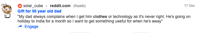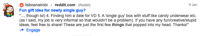 - Use r/GiftIdeas for content inspiration. There are many gift-gifting appropriate occasions to celebrate throughout the year. In addition to that, r/GiftIdeas is a wonderful source of inspiration for brands looking to get creative with their campaigns and products.