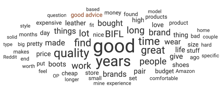 We used Brandwatch’s topic cloud component to visualize the most popular topics in advice-related discussions in r/BuyItForLife.