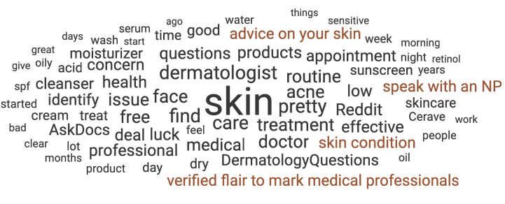 Populating common themes and topics in consumer discussions online is always a great way to start your analysis. We visualized the r/SkincareAddiction advice-related conversation on a topic cloud.