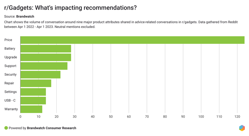 - Looking at the volume of conversation across all nine categories, price was the most discussed attribute in advice-related discussions in r/Gadgets, accounting for 46% of the advice conversation.