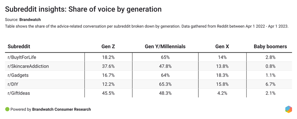 We used Brandwatch’s new Ready To Use Social Panels for Reddit to understand the audience makeup of those discussing recommendations in each selected subreddit between April 1 2022 and April 1 2023.