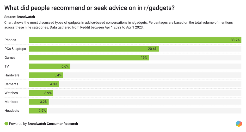 We segmented the advice-based conversation in r/Gadgets by nine popular product categories and, as you can see, phones were leading the pack with close to 34% of the conversation.