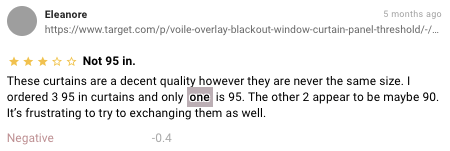 We segmented the product reviews and filtered them for the ones that mention the word “one”. As we sorted the results by the lowest rating, the pattern revealed itself: half of the reviews that mentioned the word “one” were concerned about the inconsistency in the length of the product. (One curtain was longer than the other).