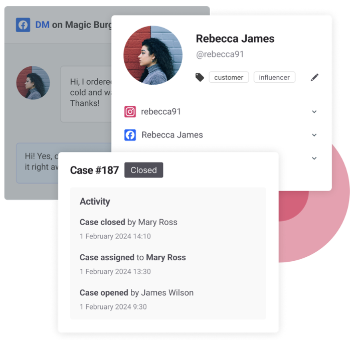 With Engage, you can easily manage cases and turn the interactions you have on social into cases. It gives you an overview of the urgency of the case, past interactions, and you can add profile cards.
