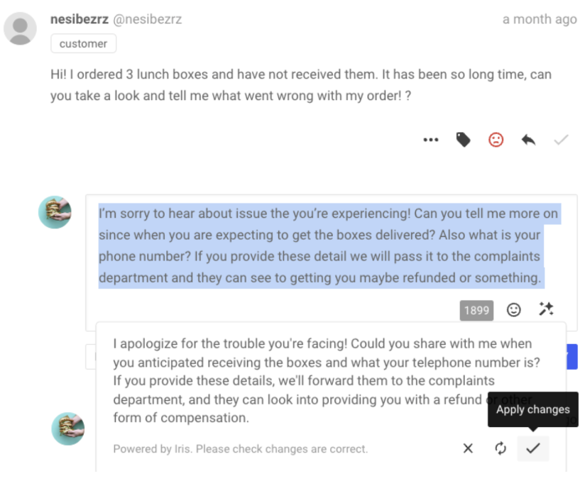 Iris, our AI writing assistant, is also part of Engage and can make your customer service efforts much easier. Iris analyzes the context of messages and drafts a response for you. If you write it yourself, it gives you tips on how to improve your writing, from grammar to tone to adding emojis.