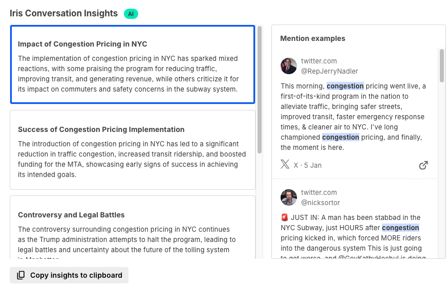 This summary highlights key themes in conversations about NYC’s congestion pricing, including its impact, implementation, and public concerns. By organizing discussions into clear themes with relevant examples, AI-powered insights provide a real-time understanding of public sentiment.