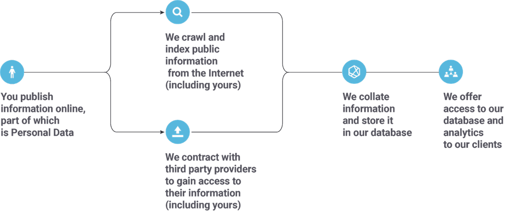 We collect and collate information that is publicly available on the Internet. If you can be identified from this information, and it relates to you, then it will be your Personal Data. For example, your name or username in connection with your Twitter or Facebook profile or the content of your public posts on these sites would be your Personal Data.In a nutshell, this is how we work: we collect and index publicly available information from the Internet. We get data via search crawling or by contracting directly with content providers and data resellers to gain access to data from them. In each case, the only information that we have access to is information that Authors like you published or made available publicly.This information is then collected, indexed, and stored in our database. We offer access to our database, as well as analytics of the data within that database, to customers (our “Services”). This allows our customers to learn more about their brand, their consumers, their competitors, and act with more certainty in their marketing decisions. The following graphic depicts how our Services work.