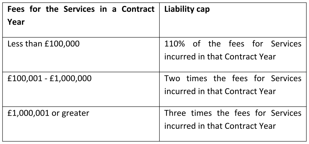 8.3. Liability cap: Subject to sections 8.1, 8.2, and 10.10, each party’s total liability, however arising, is capped at: (a) the amounts set out below for Claims in a Contract Year; and (b) 110% of the fees for the Services incurred in the first Contract Year, for Claims outside of a Contract Year.