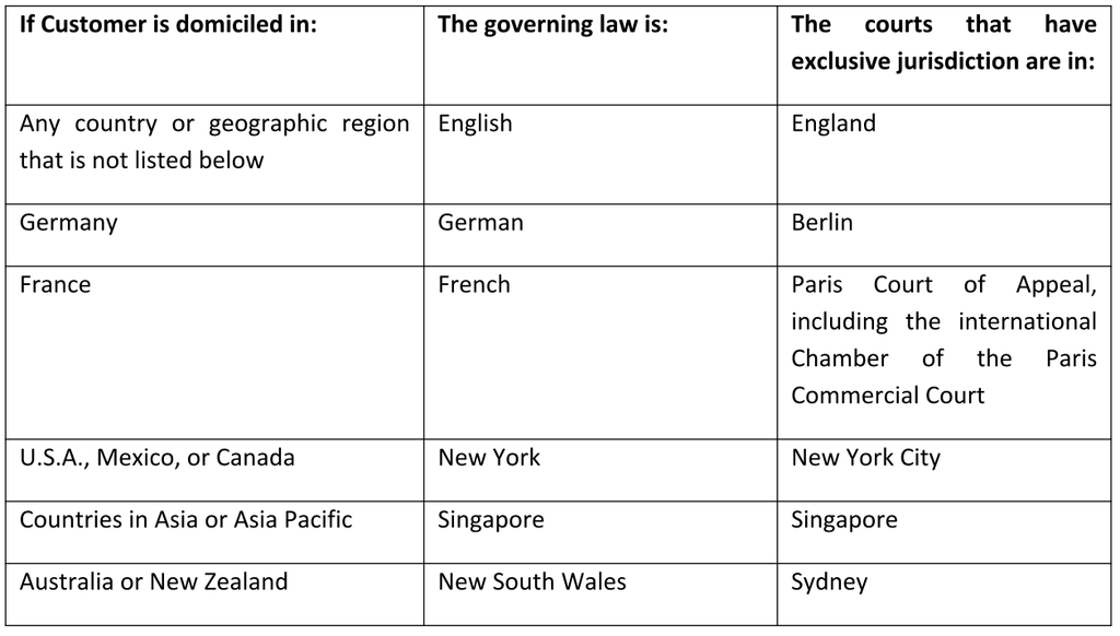 10.13. Governing law and jurisdiction: Each party agrees to the applicable governing law and jurisdiction based on Customer’s domicile, as set out in the table below.