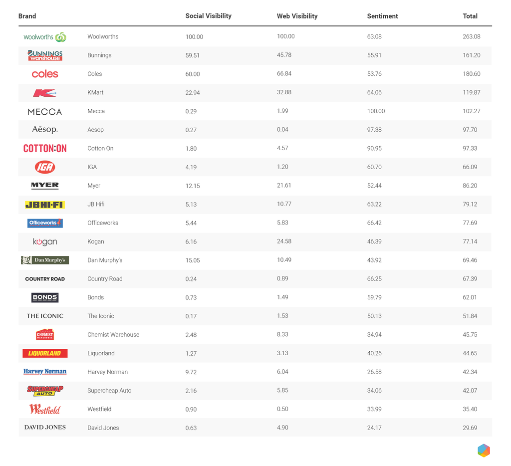 We analyzed social data using Brandwatch Consumer Research to see how top brands in the retail sector compare against each other. These scores are relative to other brands in the chart - the brand with the most mentions gets a score of 100, and the others will get a relative score, based on the mentions they got.