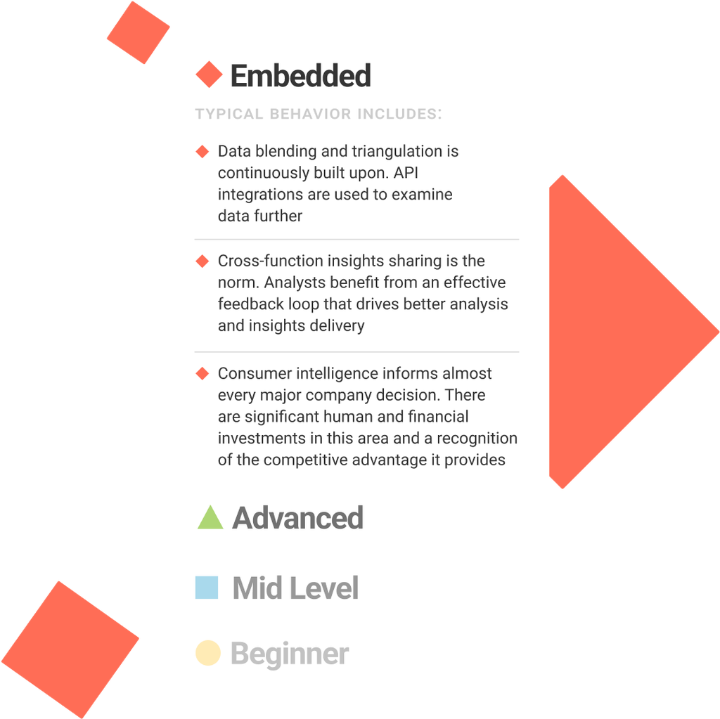 These businesses will have a deep-rooted culture of data sharing. Many areas of the business will continuously utilize the insights gathered by the team and questions and feedback will be exchanged regularly. At this stage, businesses might benefit from sharing internal success stories on how data has impacted business decisions – demonstrating the value of utilizing insights and sparking more requests. This will further perpetuate internal confidence in the benefits of consumer intelligence.
