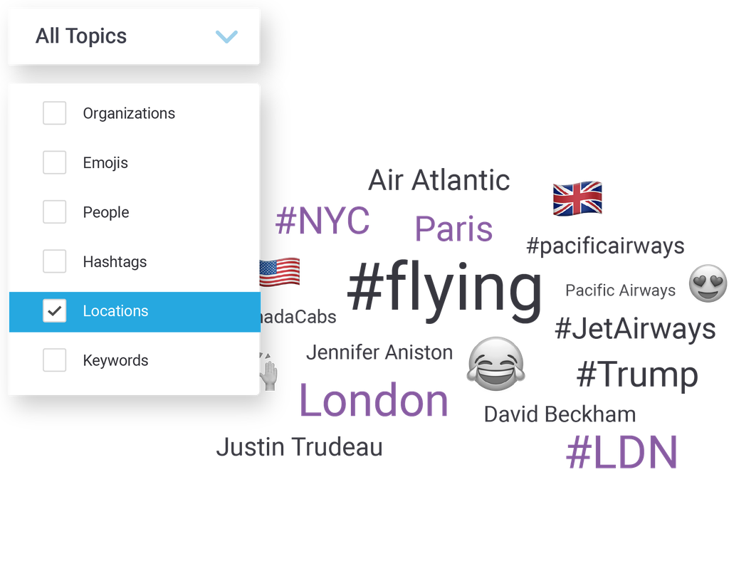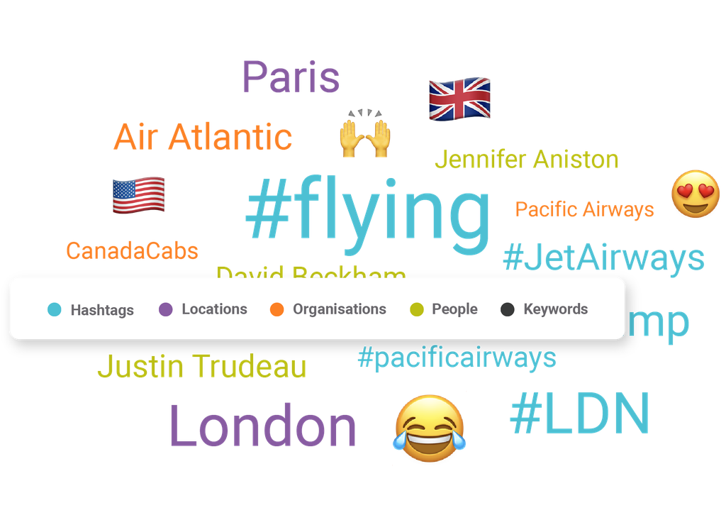Discover all the people, locations, organizations, emojis and hashtags linked with your brand, automatically.