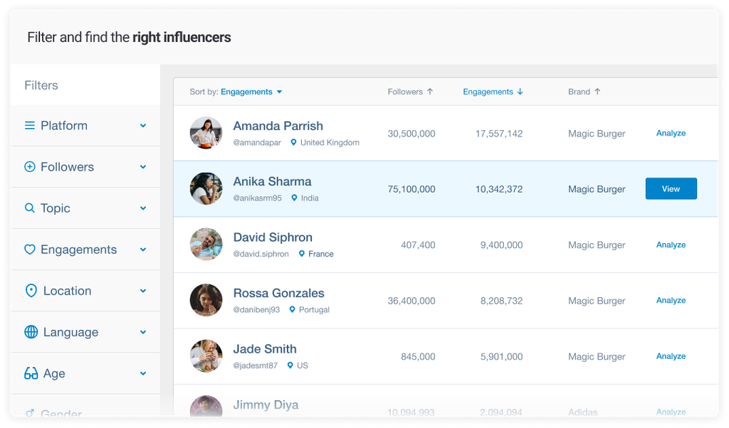 Filter by interests, brand affinities, prior brand work, credibility, and more.