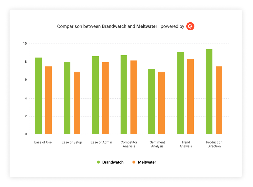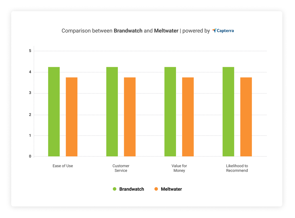 Based on real consumer reviews on G2, Capterra, and TrustRadius users rate Brandwatch's offerings for Social Media Management and Social Listening in many categories better than the Meltwater solutions.