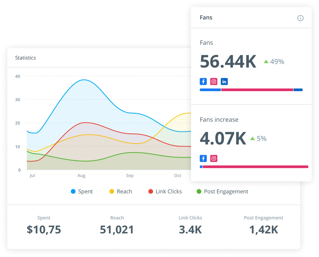 Measure your engagement, audience growth, and content performance across networks. Showcase your efforts and easily show your social ROI in easy-to-build reports.