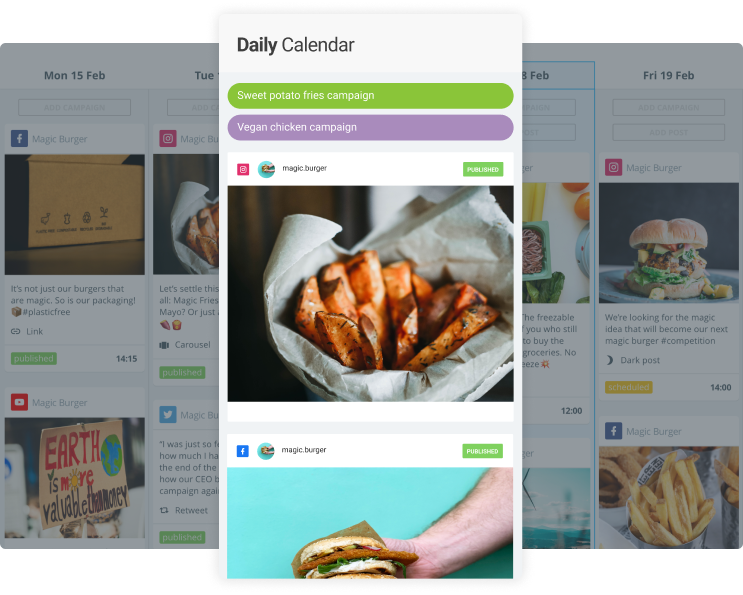 Dai post giornalieri alle campagne su vasta scala, il nostro calendario per i social media ti aiuta a rimanere organizzato e produttivo. Inoltre, le tue risorse visive sono facilmente ottimizzate per avere un bell'aspetto su qualsiasi piattaforma social.