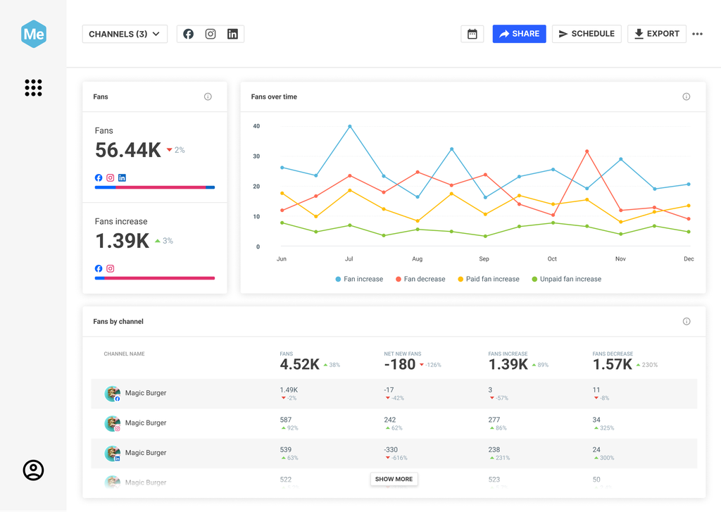 Get the best overview possible with aggregated, cross-network metrics and KPIs. See where your efforts are paying off and adjust your strategy to match. Dashboards can display data from hundreds of channels without affecting load times.