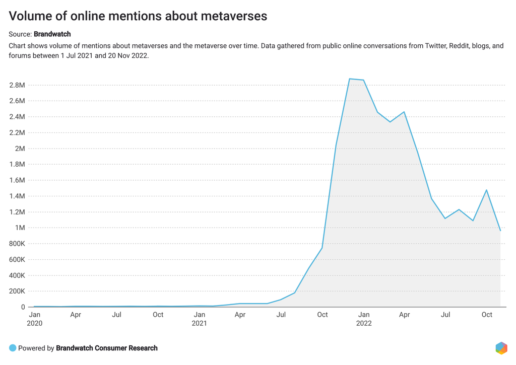 Between 1 January and 15 November 2022, there were over 19.2 million mentions of metaverses in online conversations. According to BuzzSumo, over 265k articles were published, generating over 13 million engagements.