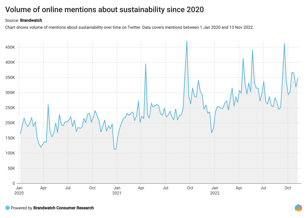 It’s nothing new that the sustainability conversation is bigger than ever. In fact, over the last three years, the conversation has grown substantially. In 2022, the conversation peaked at almost 1.5 million mentions per month in September and October.