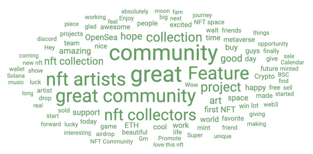 Take NFTs for example. The last couple of years have seen a boom in interest and promising projections for growth, while brands have shown real creativity in this area (see the early movers section). As you can see from this topic cloud, which shows positive mentions around NFTs online in 2022, there's a lot of excitement about the community, artists, and collections.
