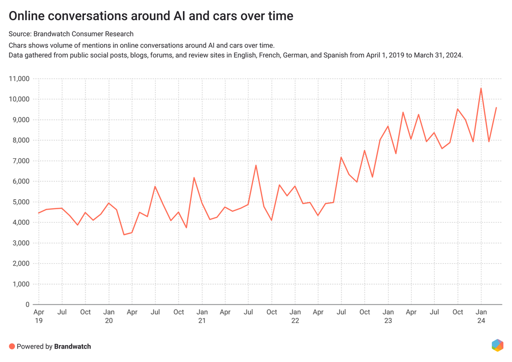 There's no industry that isn't being disrupted by AI right now, and the automotive industry is no exception. Online discussions about the automotive industry and AI have increased more than 40% from April 1, 2023 to March 31, 2024 compared to the previous 12 months.