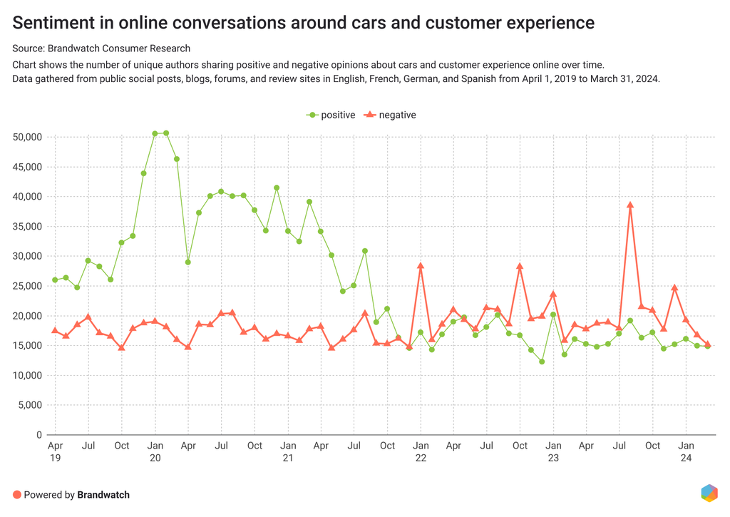 Looking at the sentiment in online conversations about cars and customer experience, the number of unique authors talking positively has decreased and is now lower than those talking negatively. Consumers appear to be having less positive experiences as time goes on.